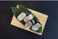 First put some sesame oil or water on your hand to prevent the rice from sticking to your hands. Now you take a portion of rice and put some filling in the middle. Then press the rice into a ball, after this make it into a triangle. - Nori