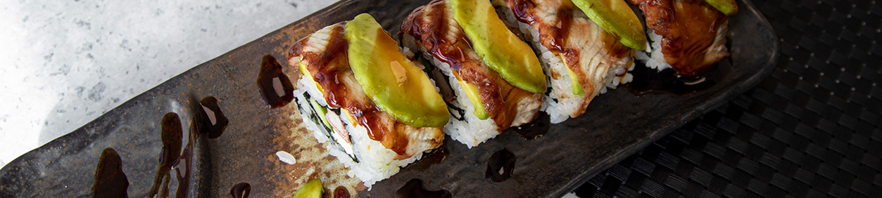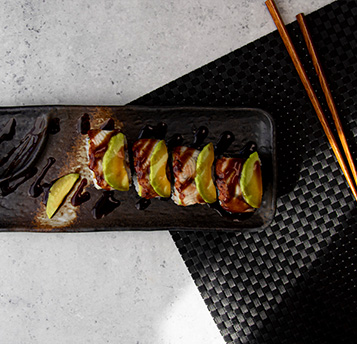The dragon unagi roll looks like you can probably guess, like a dragon. The slices of avocado and unagi on top of the uramaki roll resemble the scales of the dragon. The uramaki roll looks super festive and also tastes amazing. In this recipe we top off the sushi roll with the Eel sauce of Nihon Shokken.